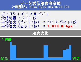 清水理史さんの記事 清水理史の「イニシャルB」 [2004/08/24]第114回:ブロードバンドテレビの魅力を探る その1 4th MEDIAとBBTVのサービス内容を比較 [2004/08/31]第115回:ブロードバンドテレビの魅力を探る その2 4th MEDIAとBBTVの導入難易度を比較する [2004/09/07]第116回:ブロードバンドテレビの魅力を探る その3 4th MEDIAとBBTVの操作性、画質を比較する によると伝送帯域は2種類あって自動的に切換わるとのことです。 標準画質:MPEG-2 2Mbps 高画質:MPEG-2 4Mbps 以下はわが家の場合です。 <BBTV付属ルータを使う前> パソコンからみたADSL速度: 4.5MB/s〜5MB/s 測定サイト: http://homepage2.nifty.com/oso/speedtest/ <BBTV付属ルータを使うと> @BBTVを見ていない時でも1.2MB/s〜2MB/sまで通信速度が落ちている。
