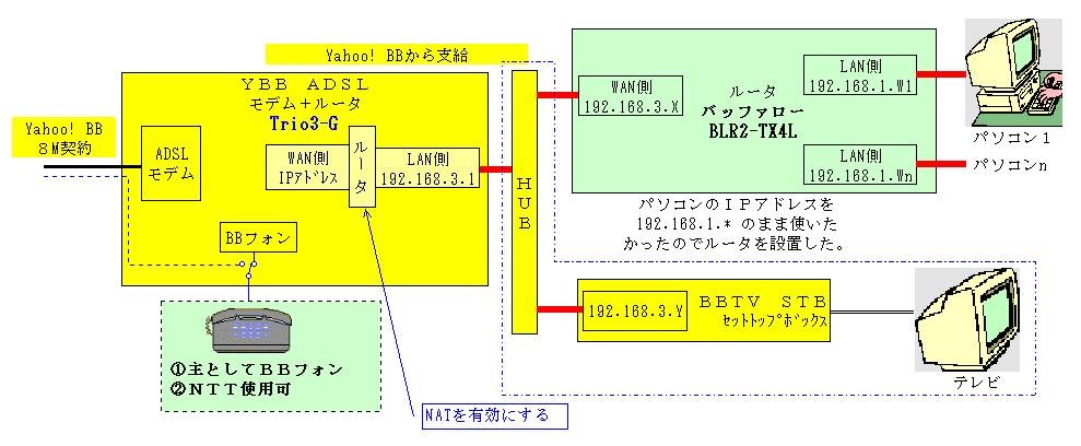 BBTVは局舎に設置した装置から映像データを通信で流すシステムです。 通信と放送が一体になっています。電子ビデオならば一時停止/早送り/巻戻しがリモコンからできます。 私の環境(ADSL実質速度5Mbps)ではだいたいスムースなのですが、ごくたまに映像が一瞬停止することがあります。 ADSL通信速度が落ちた場合、そのままにしておくと復旧には長い時間がかかります。 通信速度を復旧するにはADSLモデムの電源を切り→入りすると、通信速度が回復します。 BBTVのサービスエリアはここです。 ■ 2005年8月 BBTVは新システムに移行しました。 新型STB(セットトップボックス)と新しいモデムが送られてきました。 8M契約ですがモデムは Trio3-Gに無償交換となりました。 この Trio3-G モデムのルータ機能は NetMeeting に対応していませんでした。 外部からこちらの NetMeeting を呼び出せません。接続できないのです。 Trio3-G は下記2つの使い方ができます。 @ブリッジとして機能 NAT機能を無効とした場合です。 グローバルIPアドレスは、インターネットアクセス用に1個使えます。 Aルータとして機能 NAT機能を有効とした場合です。 グローバルIPアドレスは、インターネットアクセス用に1個割り当てられますが、NAT機能により LAN側に複数のローカルIPアドレスが使えます。 下記場合には、NATを有効にする必要があります。 ・無線LANを繋ぐ時 ・BBTVのSTBを繋ぐ時 ・複数のパソコンをHUBを介して Trio3-G に繋ぐ時 通常は、NAT機能を有効にするのみで使えます。 詳細は、付属マニュアルを参照して下さい。 Trio3-G のローカル側(自分側)にサーバ(wwwサーバ、ゲーム)を公開する場合は設定が必要です。 ・LANポート設定 ・ポート転送設定 BBフォンは新型モデム到着の頃から使えなくなりました。 8Mモデムの構成では使えないのです。 モデム交換後にBBフォンが使えるようになりました。Trio3-G に交換しないとBBフォンが使えない! この事を知って前もって準備した方がよいでしょう。 (BBフォンは使えなくてもNTTの電話が使えましたから問題なかったのですが...) 前もって送られてきた郵便には「この手紙を受領後2週間以内に機器を送る」と書かれていました。 2週間では幅が大き過ぎます。 受け取った宅急便の伝票を見ると配達日指定でした。 なんでメール等で前もって配達日を連絡してくれなかったのか?不親切です! 8M契約のままですが、スピードが速くなりました。 当家において新モデムの速度は約5Mbps(BBTVのSTBを繋がない状態)です。 (同じ条件で旧8Mモデムの速度は約4〜4.5Mbpsでした。) 新BBTVシステムでの構成(無線カード無しの場合)です。 黄色の部分がレンタルされている部分です。今回YBBから送られてきた交換用セットには面喰いました。 配線するのみでBBTVとインターネット接続の両方ができるように Trio3-G が設定されていて当然ですが... そのままでは1台しかネットワーク接続ができない。(NATが無効となっていた) パソコンとBBTVを使うためには新モデム Trio3-G の「NAT機能」を有効にする必要がありました。 このことが書かれた紙が多くの紙にうずもれてしまい見つけられなかった。 後で整理していて見つけたのですが... 要点は @パソコンのネットワーク設定を「IPアドレスを自動的に取得」に設定する。 ATrio3-G のLANコネクタ(「パソコン」と記載)にパソコンを繋いで起動する。 Bブラウザで下記を入力して Trio3-G に接続する。 http://172.16.255.254/ C「NATを有効」にする。(付属取説参照) Trio3-Gモデムはルータ機能を持っていますので外付けルータは不要です。