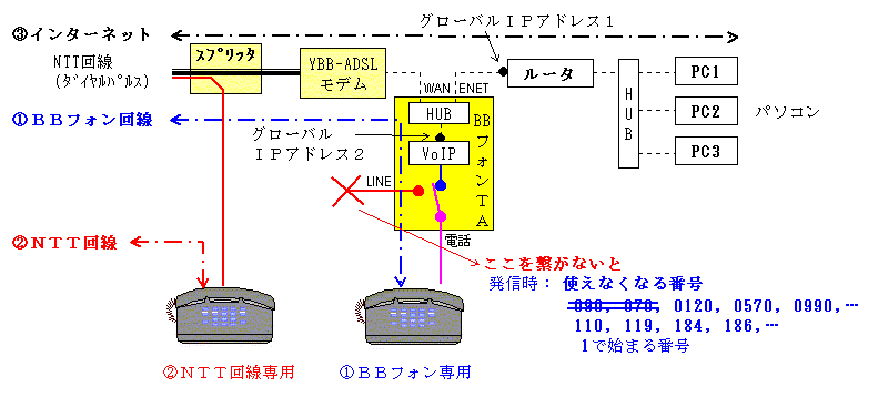 YBB(Yahoo!BB)のモデムはブリッジタイプということで、インターネットのグローバルIPアドレス がDHCPで割り当てられます。 ルータ、モデムの電源を短時間切っても割り当てられるグローバルIPアドレスが変わらず同じです。 (BBフォンTA、ルータ、パソコンの電源を長時間切った後に電源を再投入すると IPアドレスが変化しています。) 2002/7/9 今日早朝、YBBが局舎の工事を行いました。 朝起きてIPアドレスを見ると、220.*.*.* へ変わっていました。 開通後、昨日まではず〜っと 43.*.*.* で変化していなかったが... <YBBのグローバルIPアドレス> 1.YBBモデム1台を通して2個のグローバルIPアドレスが割り当て可能。 ・1つのIPアドレスはパソコンに割当られたインターネットアクセス用 ・他のIPアドレスはBB Phoneターミナルに割り当てられた電話専用 電話専用のIPアドレスが固定でないと呼び出しがややこしい。 2.これで、YBB開通当初から言われていた下記現象がやっと理解できました。 YBBって、かなり進んだビジョンを持っているようです。 ・YBB-ADSLモデムに接続したルータとかパソコンに割り当てられるIPアドレスが変わらない(変わりにくい)。 ・パソコン2台をハブ経由でYBB-ADSLモデムに接続すると、パソコン2台に異なったグローバルIPアドレスが 割り当てられて2台が同時にインターネットにアクセスできる。 (後になって、このような使い方を禁止するとのYBB通達が公表されましたが...) 3.BBフォンTAを接続した状態では、YBBモデムを通して3番目のグローバルIPアドレスは割当られない。 要するに、グローバルIPアドレスは計2個まで割当可能であることが確認できました。 4.下記のようにBBフォンTAを接続しても正常に動作しました。 下図はセパレート型の場合です。![]()