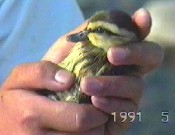 1991年5月18日、木曽川の河原です。 川幅が600mぐらいあって、カルガモの営巣地(中州)もあります。 が、たまに事故で離れ離れになる小鳥がいます。 ほんとの偶然の機会です。 河原に誰か置いていったとしか思えない状態でした。 人が大勢いる場所に、孵化したばかりの弱った小鳥がいたのでした。 かわいそうになって持ち帰り、図鑑で調べたりぺットショップで聞いて カルガモとわかりました。 |