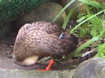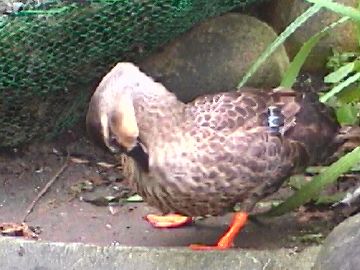 ひなのころ「ピーピー」鳴いたので娘が「ピーちゃん」と名付けました。 大きくなってからは、あひると同じで「ガーガー」鳴きます。 ただ、甘えるときは「ぴぴぴ」とか「ココココ」です。 飛べるようになるのは、だいたい2〜3ヶ月です。 我が家のカルガモは、自分を人間と思い込んでしまったようで、 他のカルガモに慣れませんでした。雌ですが。 また、賢いようで、自分より弱いと思う人間には向かっていきます。 未だに猫を怖がりません。 下水に落ちたカルガモの雛を愛鳥家の連絡で育てようとした時も 家のカルガモは、その雛をつつくありさまでした。 この雛は不幸にも死んでしまいましたが... また、近くの家で飼っていたカルガモの雄と交配させようとして 同じ小屋にいれたら、雄をつついてけんかばかりでした。 現在は、我が家の庭に、池と網の覆いを作って飼っています。 脱走を3回ぐらいしました。 人なつっこい鳥です。 大きくなると、雪の降る冬でも池の中に浮かんで寝ています。 凍傷にならないようです。 なにせ、水が好きな鳥です。 それから、小さいときは羽に油をつけることが十分でないようで、 長時間水に入れません。 現在は、池の水が数日で汚くなります。 池がカルガモのせっちん(トイレ)代わりになっていますので、 水替えを毎週行います。 |